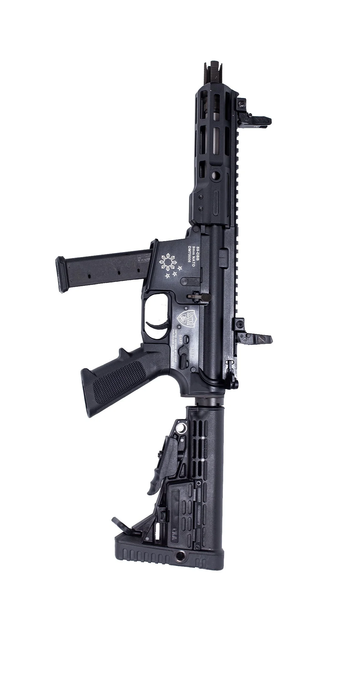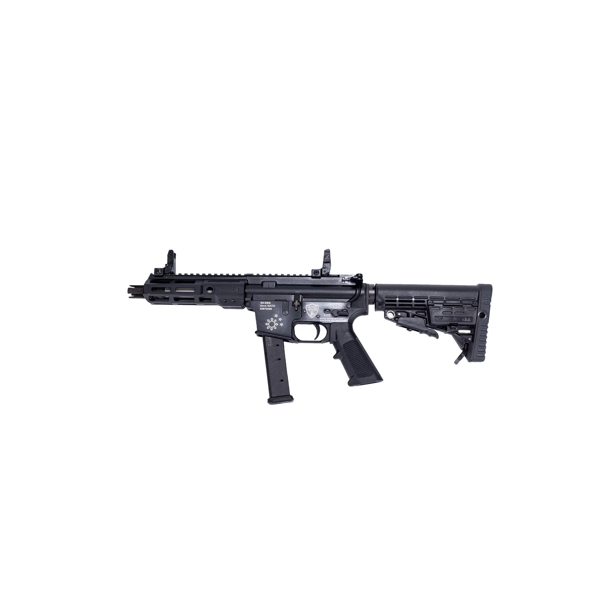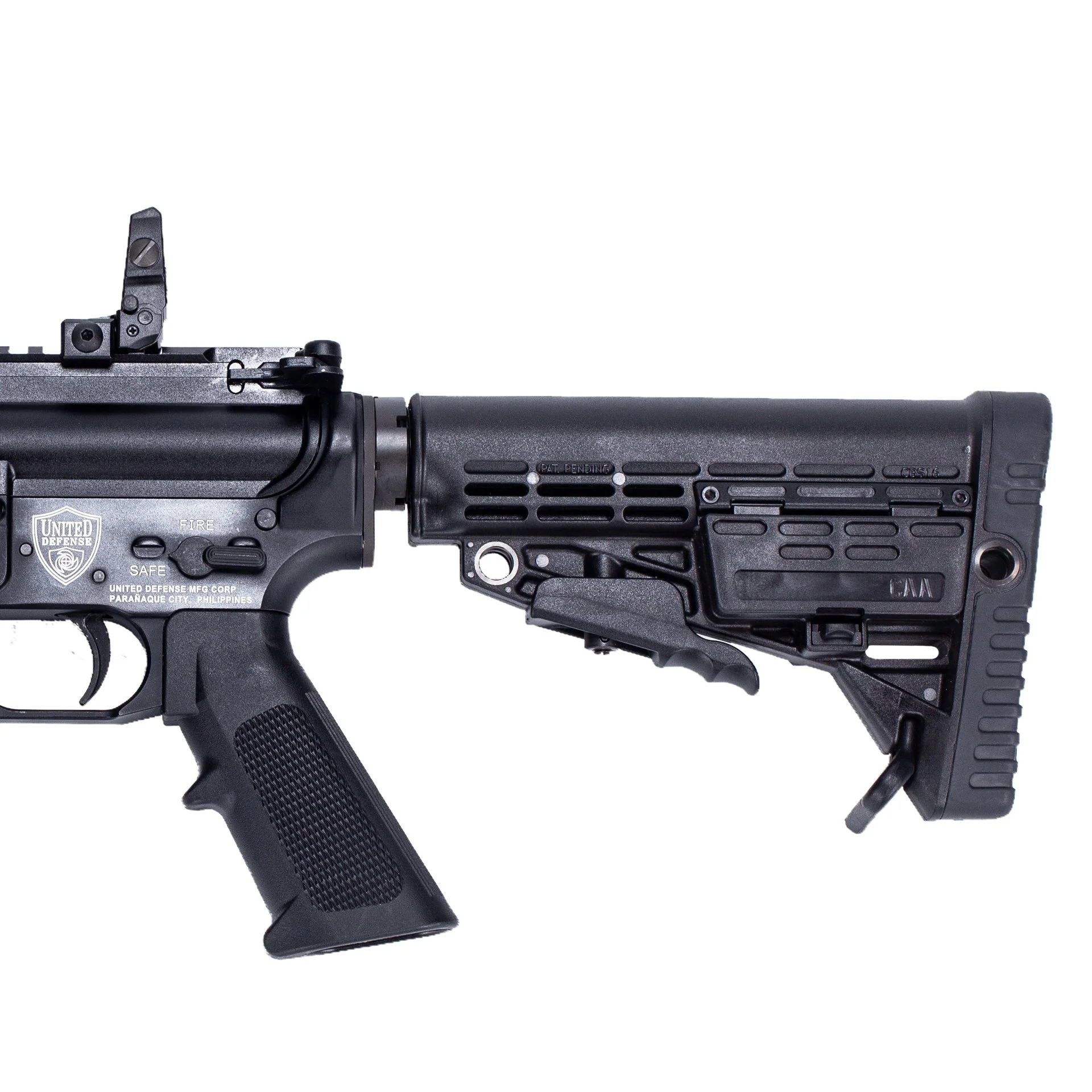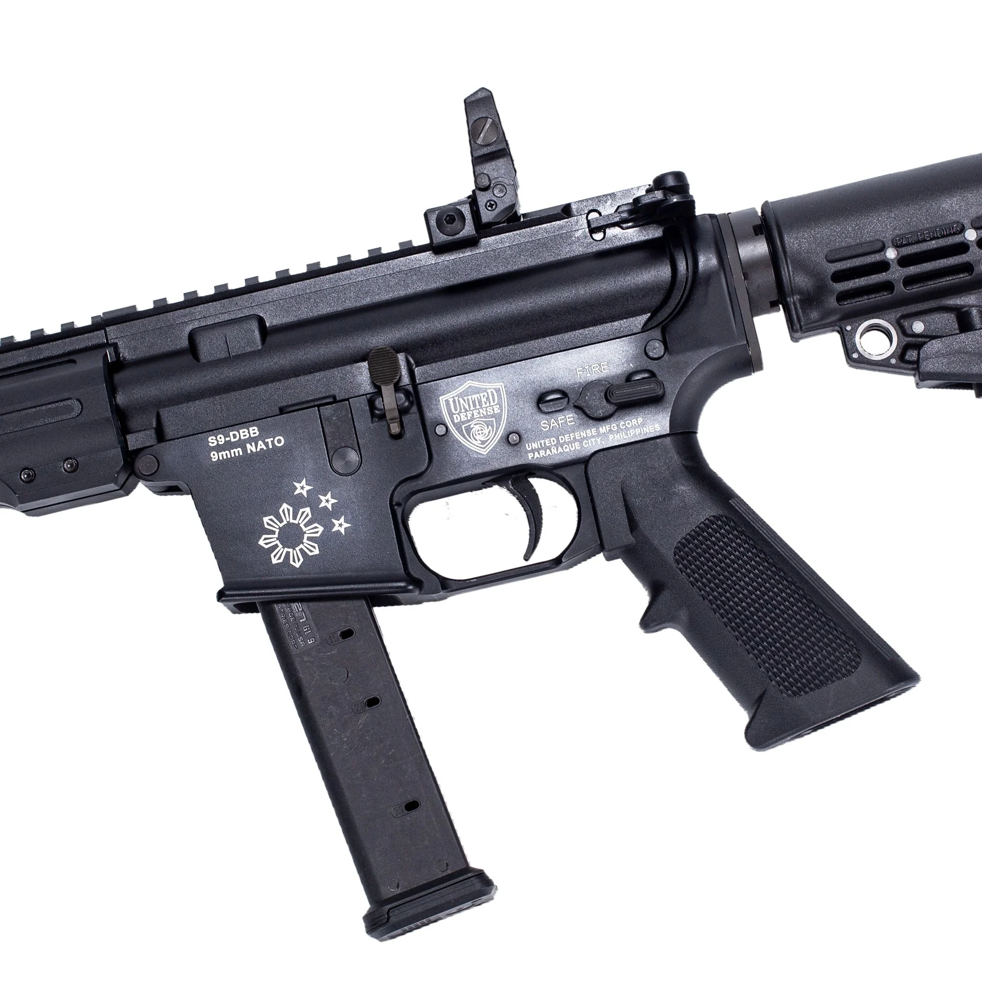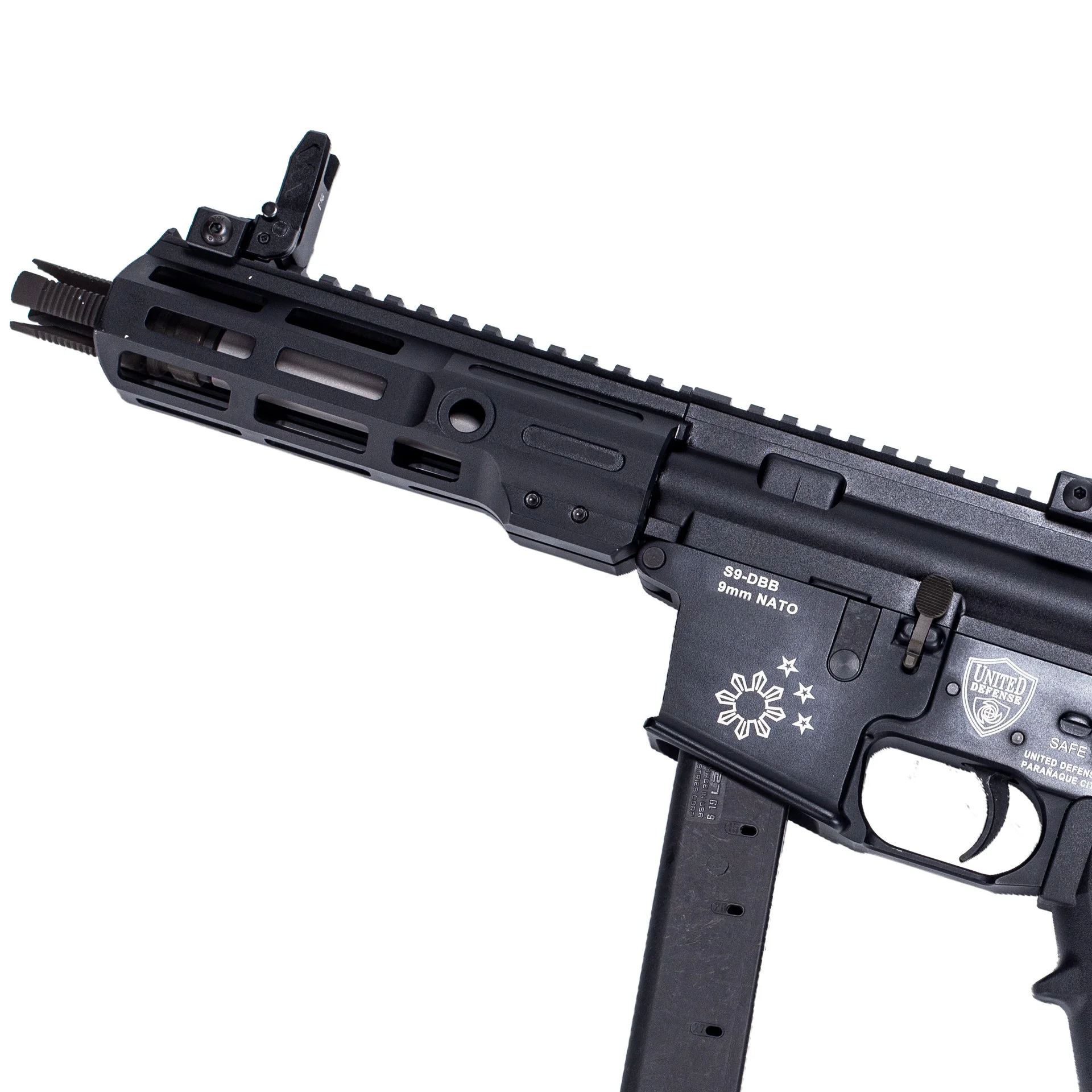 United Defense Mfg Corp's S9-DBB civilian semi-automatic carbine is a pistol caliber carbine inside an AR-looking rifle chambered in the time-tested 9mm NATO round (9x19mm) and designed to hit point targets up to 150 meters. The S9-DBB semi-automatic carbine of United Defense takes after the AR-looking rifle designed by Eugene Stoner but using the 9mm Glock magazine and other after-market 9mm Glock-style magazines. It uses the very simple delayed straight blowback system influenced by the design of Ferdinand Mannlicher in earlier years. In this design, the breech block is delayed after the round is fired to make sure that the ammunition cartridge is fully supported while under high gas pressure. UDMC did not design the system using the rotary or roller delayed blowback as it believes it is unnecessary, adding more moving parts that will be subject to wear and tear while the weapon is in battery.